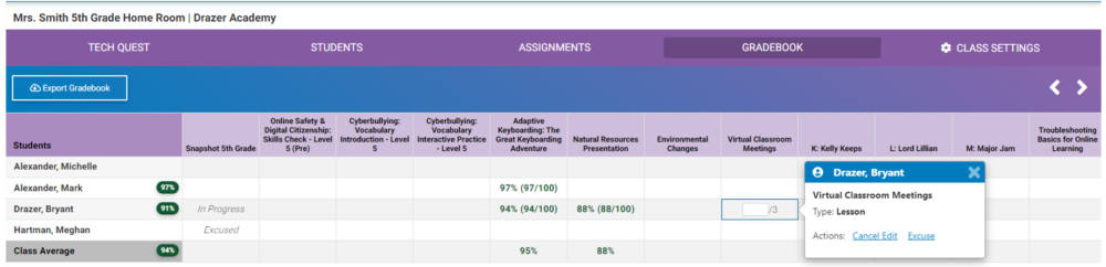 - Change or excuse scores. You can now add a manual score or excuse a student from completing a specific item in the gradebook.